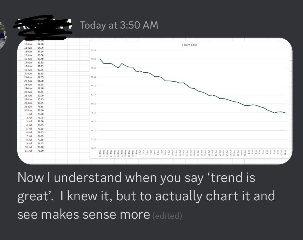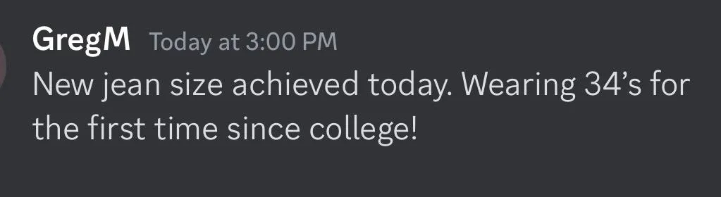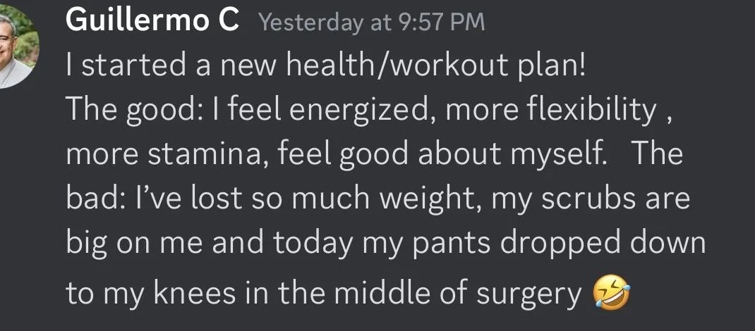 I'm wearing a shirt at work that I couldn't wear for a long time and l'm on the last hole in my belts. Taking the stairs at the office this morning in a pair of jeans I barely fit in last year and I had to stop on every floor to hike them up. This program is better than all the therapy I've done."