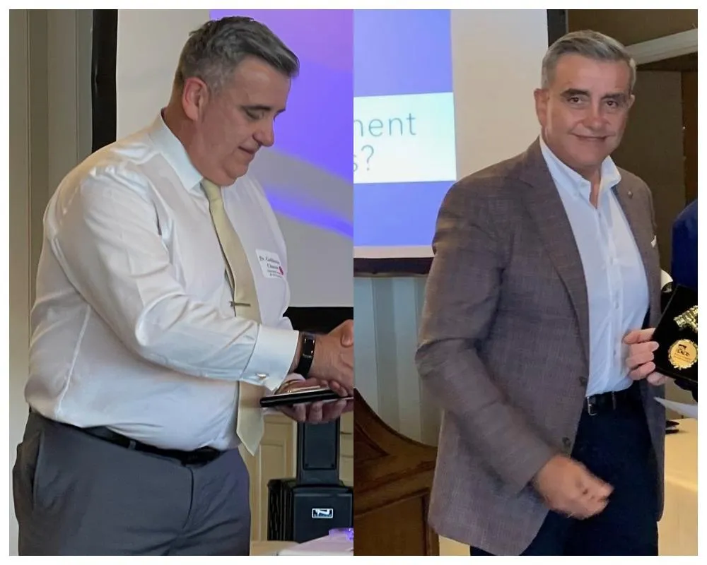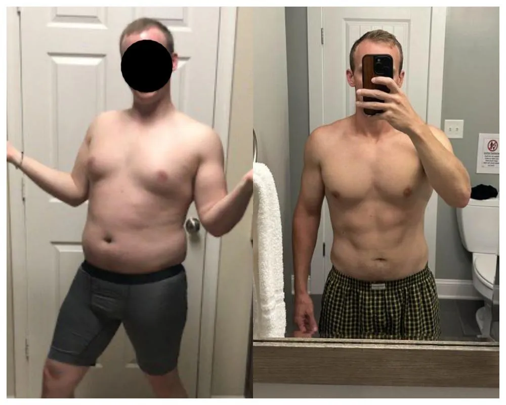 "These two pictures are taken exactly one year apart. In the first one, I'm wearing a neck size 18 shirt and size 40 pants.